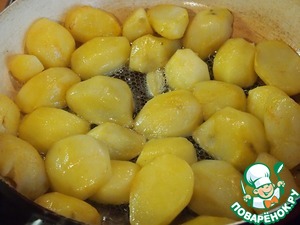 Для этого рецепта нужна баночка жемчужного лука, это маринованные маленькие луковки. Для ускорения процесса готовки заранее очистить небольшой картофель, разрезать вдоль на две половинки и сварить в подсоленной воде. Полностью остудить. Это необходимо, чтобы он потом не развалился при обжаривании. Я всегда варю накануне.