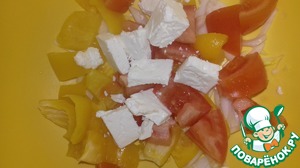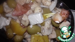 Нарезаем крупным кубиком перец, помидор и фету. Лук полукольцами. С грибов сливаем жидкость и добавляем к овощам