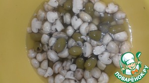 Шампиньоны режем и смешиваем с баночкой оливок, т. е. и с оливками, и с маринадом от них. Добавляем соль и лимонный сок. Складываем в банку и оставляем на пару часов))) в принципе, на данном этапе можно заправить оливковым маслом и употреблять))) но, мы идем дальше...