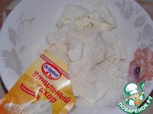 Для начинки смешать в чашке творог, сметану, 2ст. л. сахара, ванильный сахар.