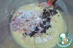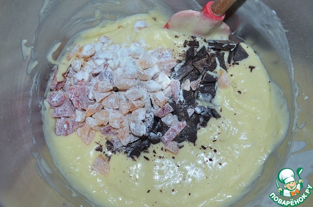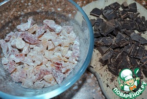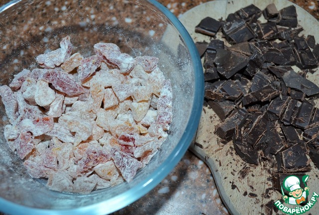 Сухофрукты нарезать, припудрить мукой, перемешать.