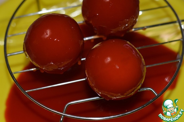 Для глазури смешать томатное пюре с глюкозным сиропом, довести до кипения. снять с огня. Желатин распустить, добавить в пюре, остудить до комнатной температуры.