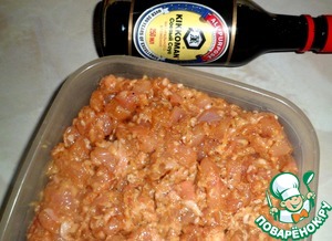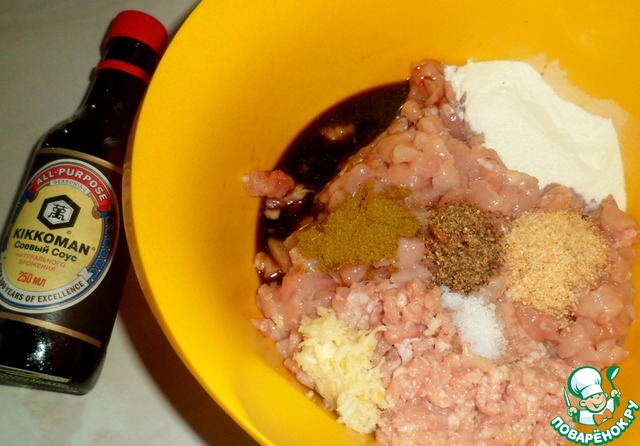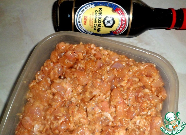 Очень удобно, чтоб курица была слегка подмороженная. Срезать с нее все мясо, вместе со шкуркой. Шкурку перекрутить через мясорубку, мясо - нарезать мелкими кусочками. Добавить в фарш соевый соус ТМ Киккоман, сухое молоко или сливки, давленный и сухой чеснок, хмели-сунели, соль, смесь перцев. Туда входит и острый, если нет такой смеси, добавить по вкусу отдельно.