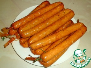 В противень налить стакан воды, поставить решетку, Разложить сосиски, наколоть маленькой иглой сверху, в двух-трех местах. Смазать растительным маслом. Поставить в нагретую до 180°C на 30 минут. Затем смазать соком от жарки и еще поставить на 30 минут, поливая соком, через каждые 10минут.