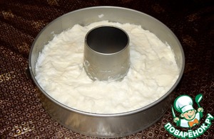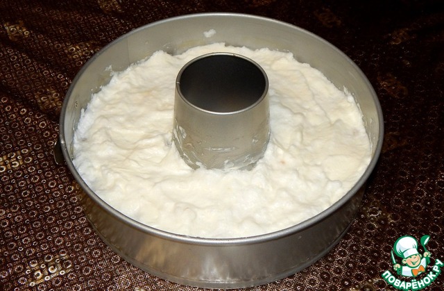 Выложила творожный сыр с взбитыми белками на тесто в форме.