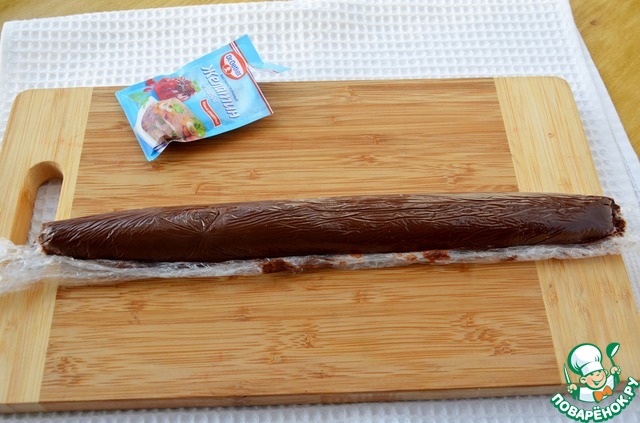 • Через минут 20-30 достать шоколадную "колбаску" и округлить её в более круглую "колбаску", при этом крем не должен ещё замерзнуть. Оставить в морозилке на несколько часов.