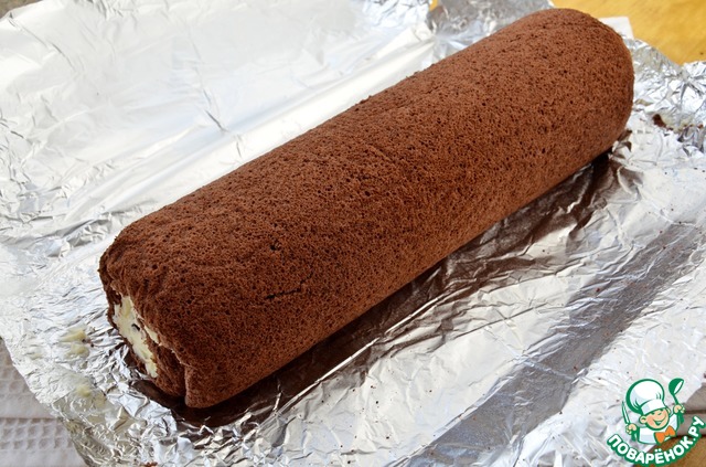 • Готовый корж снять с противня вместе с бумагой, накрыть сверху его полотенцем и свернуть вместе с бумагой и полотенцем. Оставить остывать часа на 1,5-2.