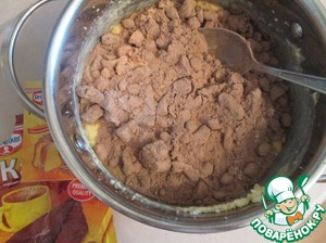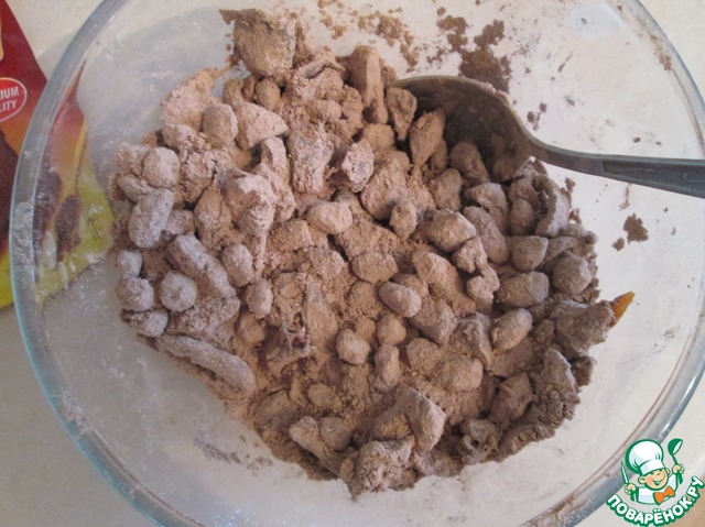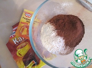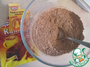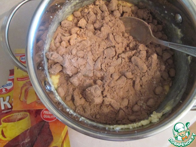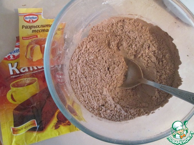 В отдельной посуде соединить просеянную муку, разрыхлитель для теста и какао-порошок.