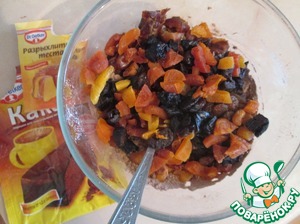 Сухофрукты заранее замочить в фруктовом сиропе и оставить на ночь.