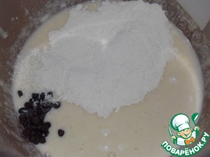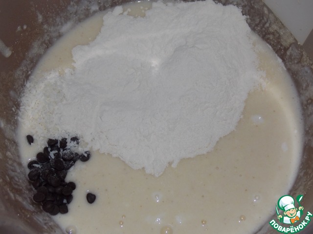 Добавить кокосовую стружку, шоколадные капли и муку, перемешать.