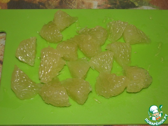 Мякоть помело очистить от пленок, порезать на крупные кусочки.