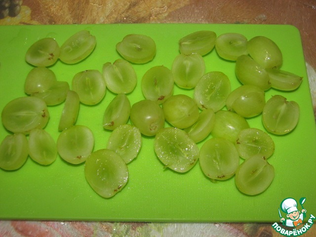 Виноградинки разрезать пополам.