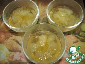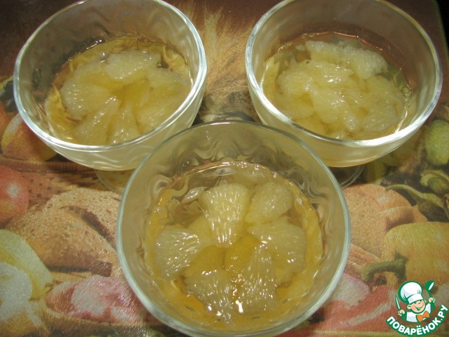 В порционную посуду выложить кусочки помело, залить частью сока, поставить в холодильник на 20 минут до легкого застывания.