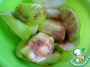 Три яблока нарезать на 4 части, добавить мед и корицу, хорошо рукой перемешать, чтобы все соединилось, как бы втирая мед с корицей в яблоки.
