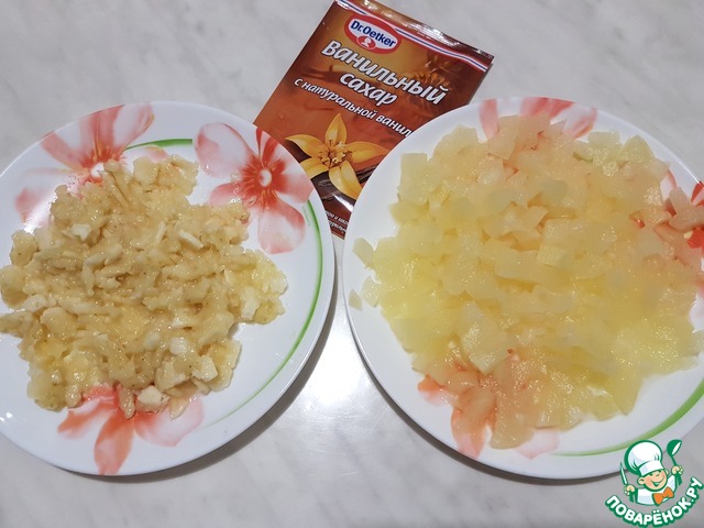 Разминаем вилкой банан. Ананасы режем на кусочки. Я взяла консервированные ананасы.