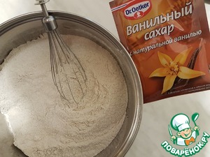 В отдельной миске смешиваем все сухие ингредиенты (мука, сахар, ванильный сахар (я использую «Dr. Oetker» с натуральной ванилью), сода, корица)
