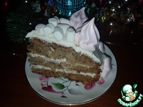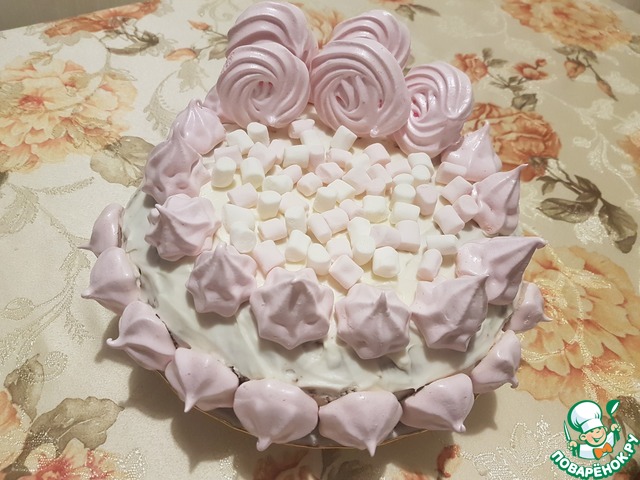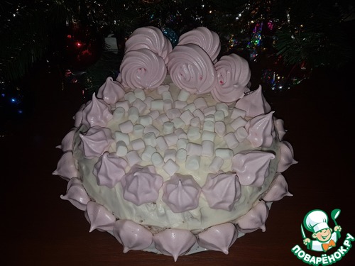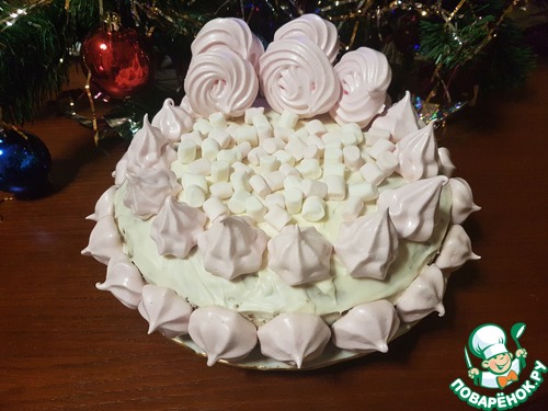 Я свой корж разрезала на 3 части. Каждую часть промазываем кремом. Украшаем на свой вкус. Я использовала маршмеллоу и безе. Как делать безе, я писала в рецепте торта "Новогодняя ёлочка" http://www.povarenok .ru/recipes/show/148 468/