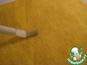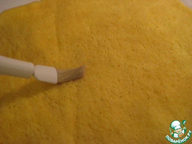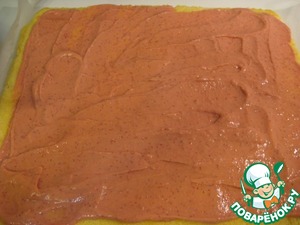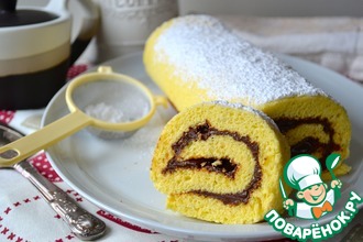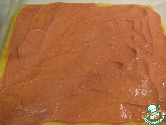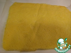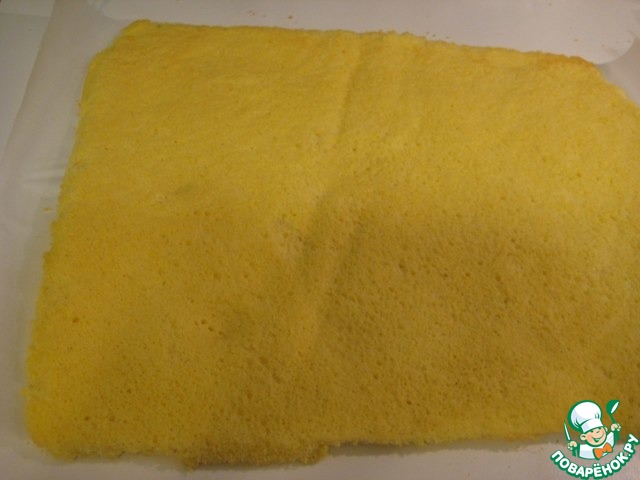 Противень застелить бумагой для выпечки, выложить тесто, разровнять. Выпекать при температуре 180 градусов 12-15 минут до румяного цвета. Подготовить лист бумаги для выпечки размером с противень, горячий бисквит перевернуть на новый лист бумаги, снять бумагу сверху, свернуть рулет. Остудить.