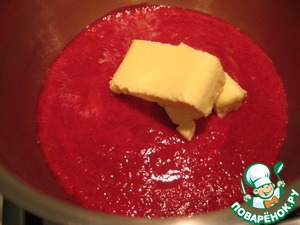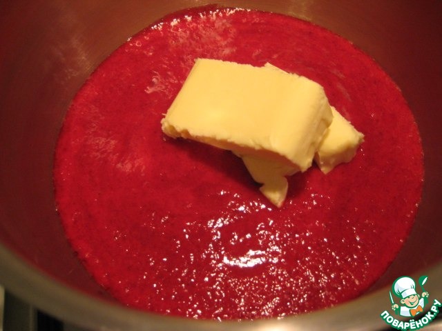 Брусничный курд: бруснику разморозить, протереть через сито, положить брусничное пюре в кастрюлю, влить лимонный сок, положить сливочное масло. Растворить масло на небольшом огне.