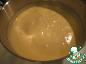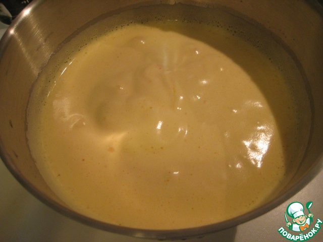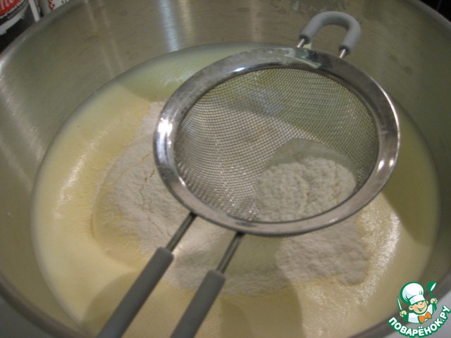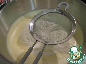 Просеять муку в яичную смесь, вмешать лопаткой.
