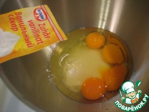 взбить яйца с сахаром и ванильным сахаром до побеления и увеличения объема в 2,5-3 раза. -