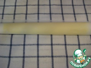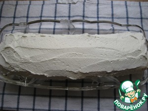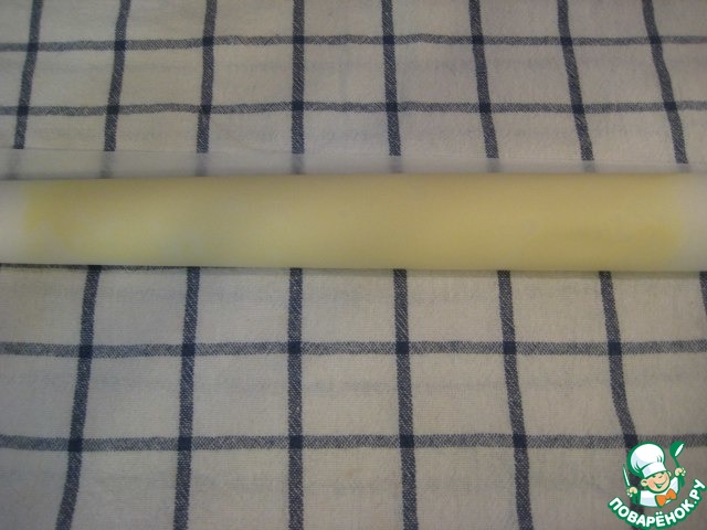 Сверху накрыть таким же листом бумаги для выпечки, прижать, свернуть в рулет и убрать в морозильную камеру на 15 минут.