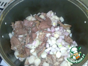 Мясо обжариваем в небольшом количестве масла, добавляем порезанный лук и тушим до готовности. У меня тушилось 35 мин., но это зависит от мяса. Мясо должно стать мягким и нежным – буквально таять во рту. Когда мясо почти готово – посолить, поперчить, добавить немнолжко паприки и кари.