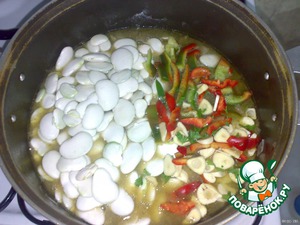В кастрюлю с готовым мясом добавляем 1 стакан горячей воды, кладем свежую фасоль, перец, половину петрушки и половину чеснока. Все осторожно перемешиваем,чтобы не повредить нежную фасольку, даем закипеть и варим на медленном огне 10 мин.