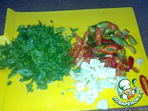 Пока мясо тушится, мелко нарежем петрушку, сладкий перец – соломкой, чеснок – тонкими пластинками.