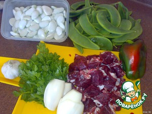 Фасоль очищаем от створок. Мясо режем кусочками.