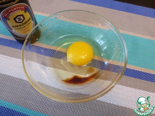 Приготовим омлет. Разболтаем яйцо, добавим соевый соус (1ч. л.), щепотку сахара.