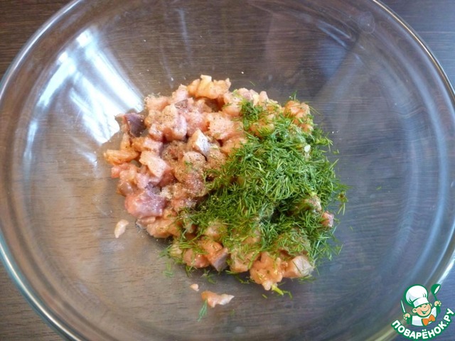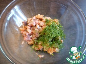 Подкопченную красную рыбу разобрать на кусочки, косточки вытащить. Добавить мелко нарезанный укроп.
