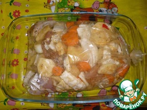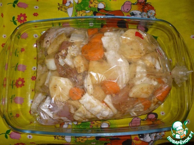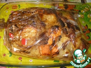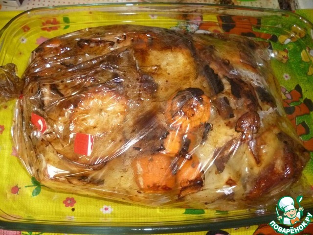 Сложить всё в рукав, завязать. Можно отправлять в духовку. Выпекать при 180 градусах около часа. Не забудьте проколоть пакет в нескольких местах.