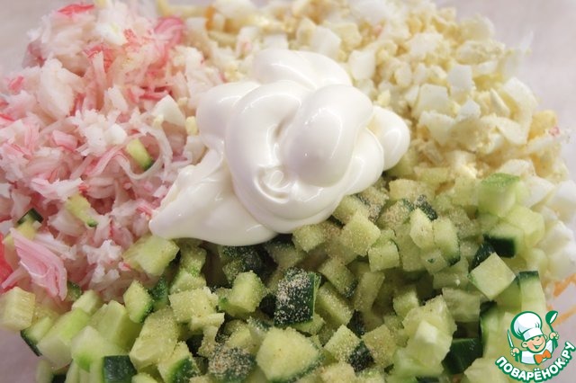 Крабовое мясо, яйцо, огурец мелко нарезаем.