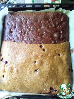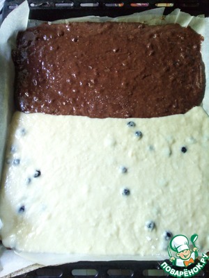 На противень с пергаментом вылить оба теста так, чтобы они не перемешались. Я ставила картон, обмотанный пищевой плёнкой.