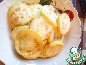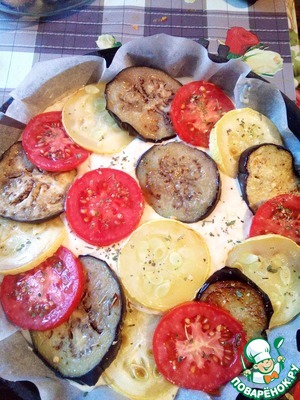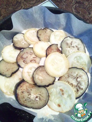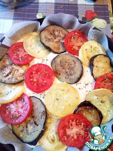 И выкладываем оставшиеся баклажаны, кабачки и кружочки свежего помидора.
