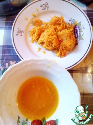 Морковь натереть на мелкой терке, обжарить на 50 мл растительного масла, затем отжать жидкость от моркови.