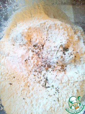 Смешать просеянную муку, соду, соль, сахар и специи ( у меня итальянские травы). -