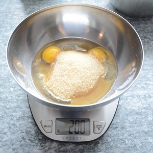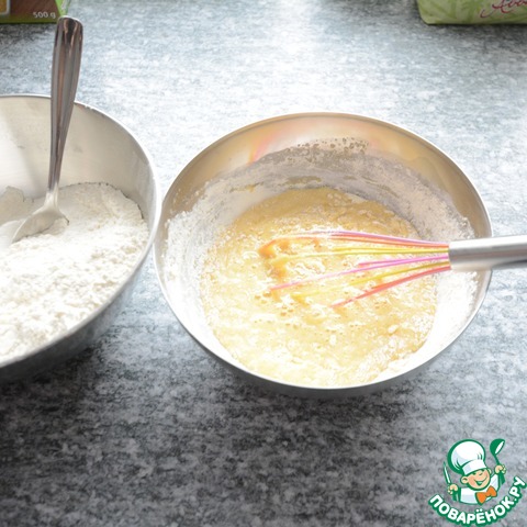 Помешивая добавить половину муки к яйцам с сахаром, когда венчиком уже не перемешать, начинаем мешать ложкой.
