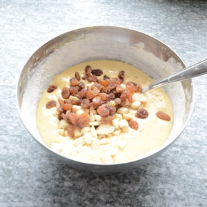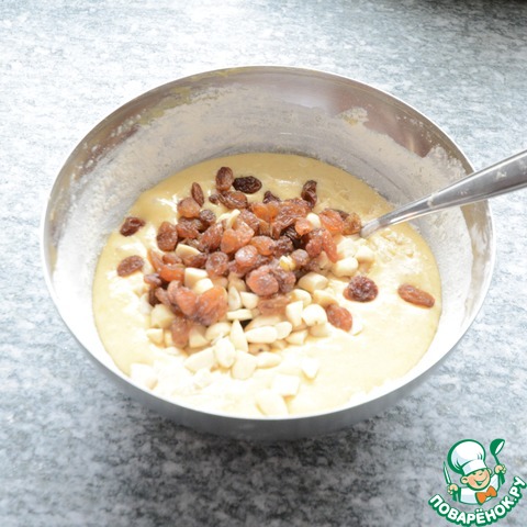 Добавить крупно порубленный миндаль и изюм (или другие орешки)