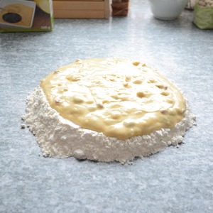 Высыпать на стол оставшуюся муку, примять горочку и вылить сверху жидкую часть, теперь тесто нужно вымесить на столе.