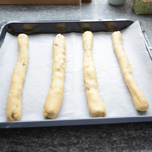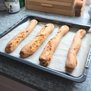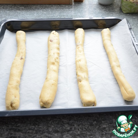 Когда батончики будут готовы, нужно их нарезать ломтиками толщиной 1,5 - 2 см, выложить ломтики снова на противень и отправить в духовку еще на 5 минут подсушить.