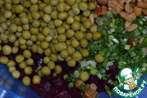 Добавить отцеженный зеленый горошек и измельченный чеснок.