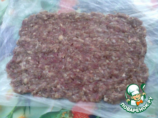 • Переложить фарш на пакет и осторожно сделать пласт толщиной 2-3 мм.