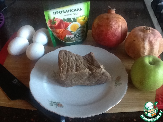 Отварить говядину, 1,5 часа. Отварить яйца до состояния вкрутую. Натереть яблоко зеленое (жесткое). Очистить гранаты.
