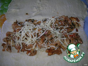 Тесто выкладываем на муку, раскатываем. В пачке было 2 пласта, кладём их рядом. На конец пласта выкладываем начинку, посыпаем тёртым сыром.