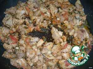 Отделяем мясо от костей, мелко режем используя ножи "Scarlett". На разогретой сковороде "Scarlett" обжариваем мясо на растительном масле, добавляем мелко резаный лук, пережариваем, добавляем мелко резаные помидоры, пережариваем. Добавляем мелко резаную зелень (у меня укроп, петрушка). Добавляем соль, приправу (у меня "Узбекская"), горчицу, кетчуп, майонез, чтобы вкус был в меру остро-кисло-сладким. Тушим около пяти минут.