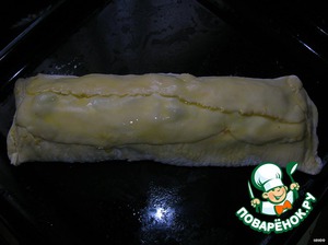 Сверху смазываем желтком, перекладываем на смоченный холодной водой противень.