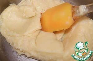 Вернуть кастрюльку с тестом на медленный огонь и, постоянно мешая в течение 2-3 минут, дав выпариться лишней жидкости, заварить тесто. Готовое тесто легко собирается за лопаткой одним комком. На фото видно, что дно кастрюльки слегка покрывается корочкой теста, это может служить ориентиром о его готовности.