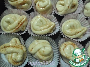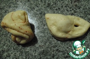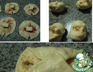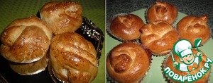 2) Как и в первом варианте, посыпать чесночным порошком, паприкой, в центр кусочек сыра, с одной стороны сделать надрез, с противоположной стороны разрезать край. Боковые края соединить между собой в центре, разрезанный край продеть в надрез, вынуть, получились краешки узелочка, так же уложить в формочки. Перемешать одно яйцо с одной ст. л. молока, смазать булочки, часть булочек я посыпала морской солью.